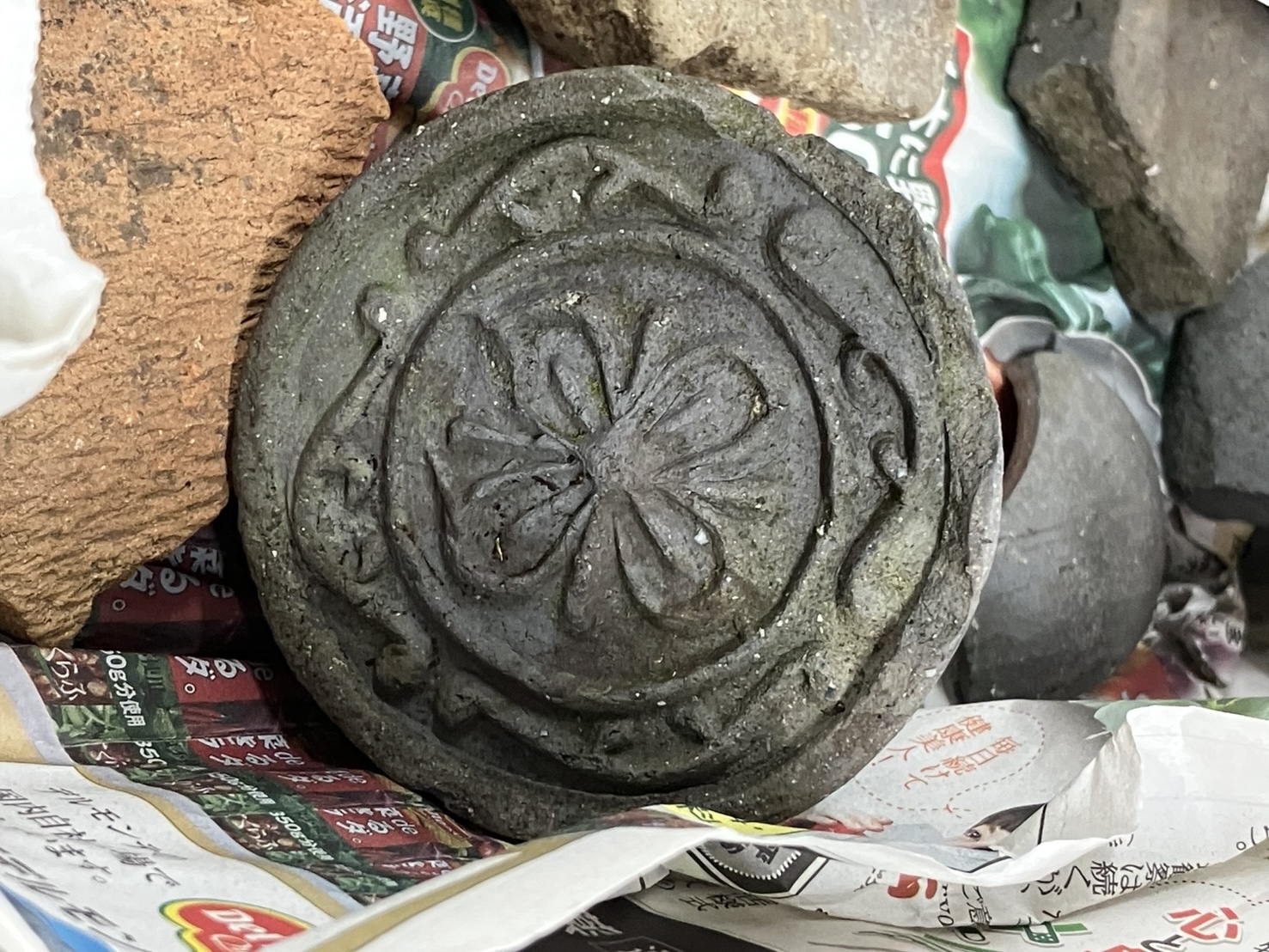 行ってみると、斜面のところどころに瓦が表出している部分がありました。中には、唐草文様が入った立派な軒平瓦もあったんです。